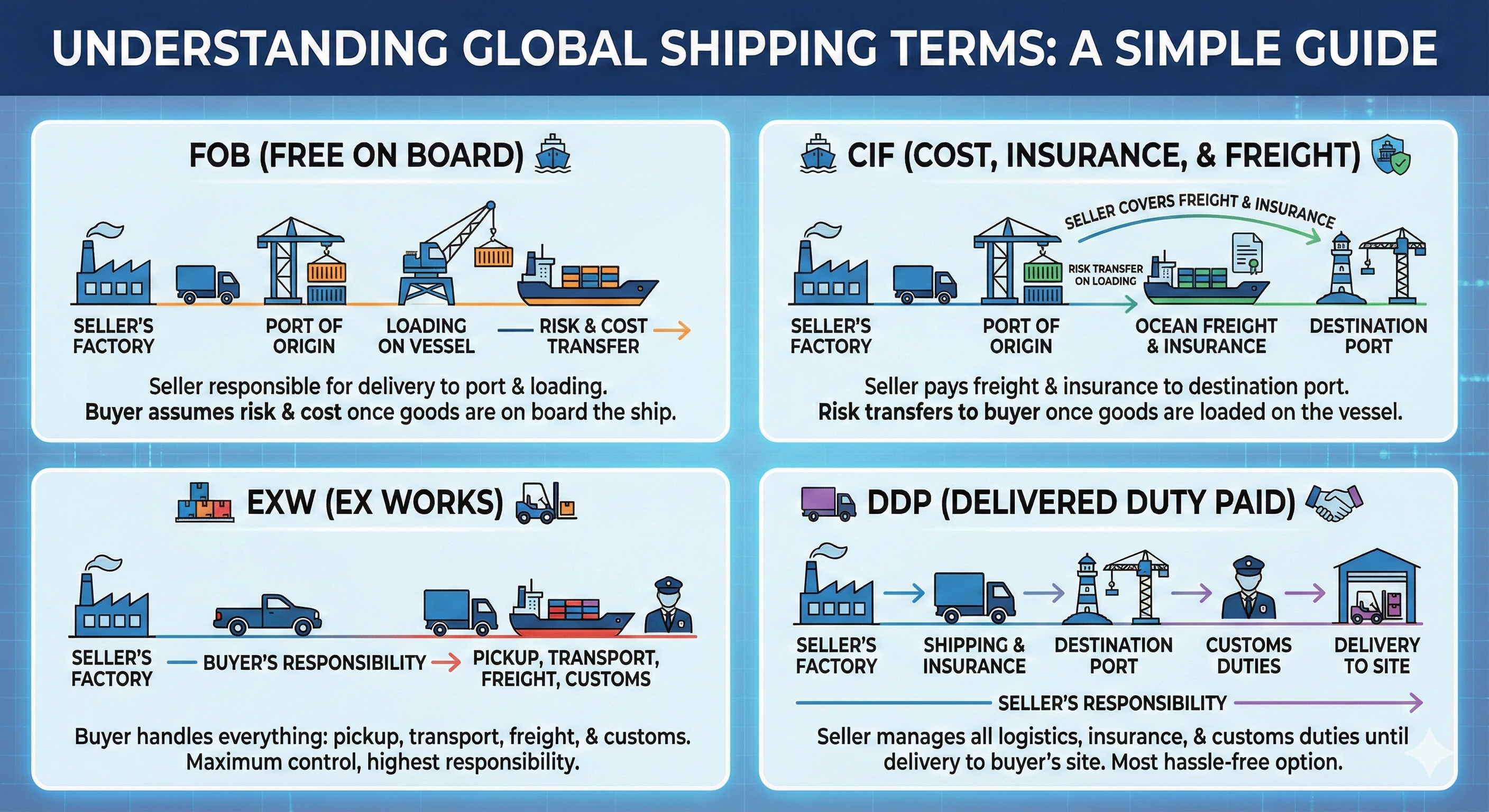 EXW (Ex Works): The buyer handles almost everything pickup, transport, freight, and customs. It offers full control but higher responsibility for the importer.