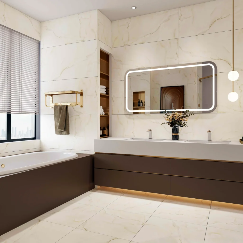 Glossy Polished Tiles – Easy Cleaning, High Shine: Polished tiles remain popular for bathroom walls and backsplashes, where their reflective surface adds brightness and depth. They’re easy to wipe clean, making them perfect for high-splash zones. However, they’re not recommended for wet floors, where slipperiness can be a risk.