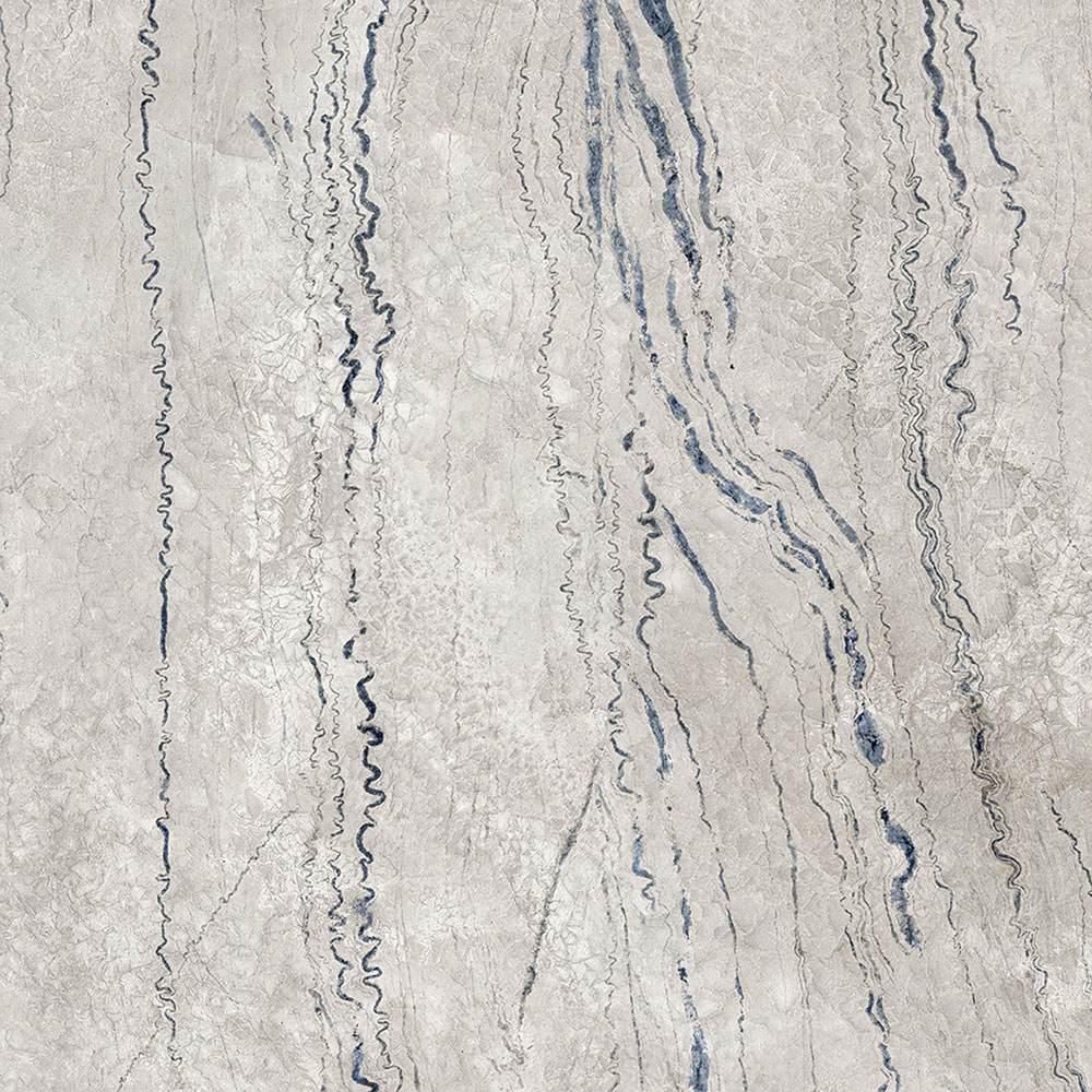 The design is marked by fluid, wavy veins that meander across the surface, creating a sense of movement and rhythm. These dark blue lines contrast beautifully against the lighter background, guiding the eye and adding a dynamic element to the tile. The randomness of the veining contributes to a naturalistic feel, reminiscent of geological formations, while maintaining a sense of uniformity that is pleasing to the eye.