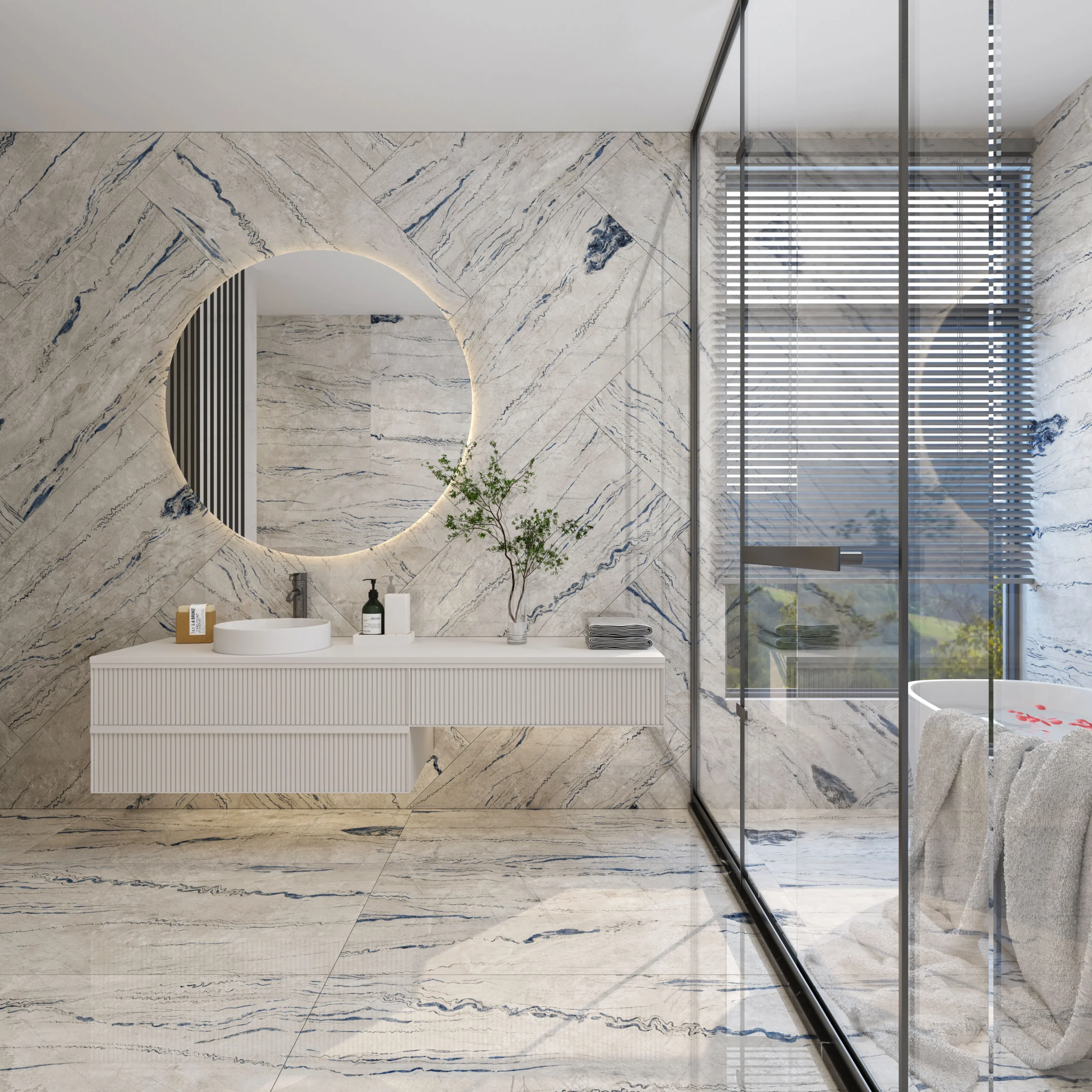 The ‘Bianco Napoleon’ tile combines elegance with contemporary aesthetics, featuring a light color palette of soft whites and creams accented by striking dark blue veining. Its glossy finish mimics polished marble, creating a smooth texture that invites touch and enhances depth, making it a versatile choice for any space.