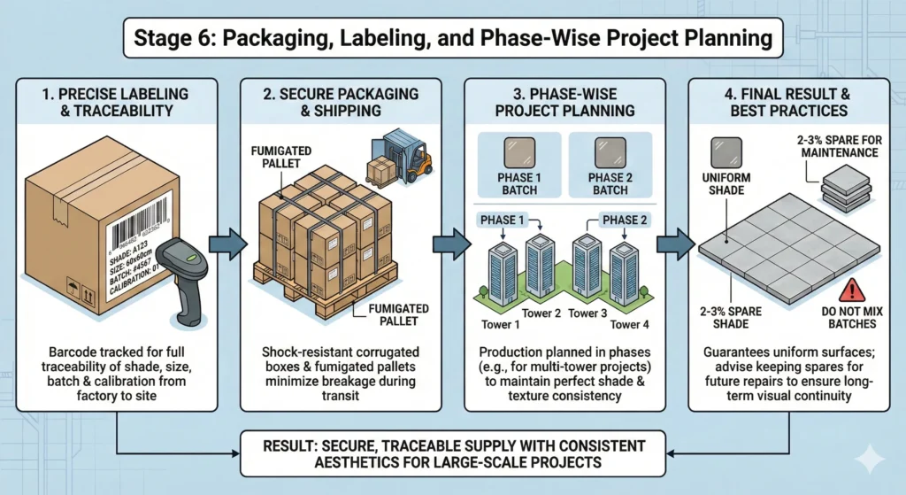 For UAE and other multi phase projects such as 4 tower developments, Ramirro Ceramica plans production in Phase 1 and Phase 2 batches to maintain perfect shade and texture consistency throughout the build. Contractors are also advised to keep an additional 2 to 3% of tiles for future maintenance or repairs, ensuring long term visual continuity.