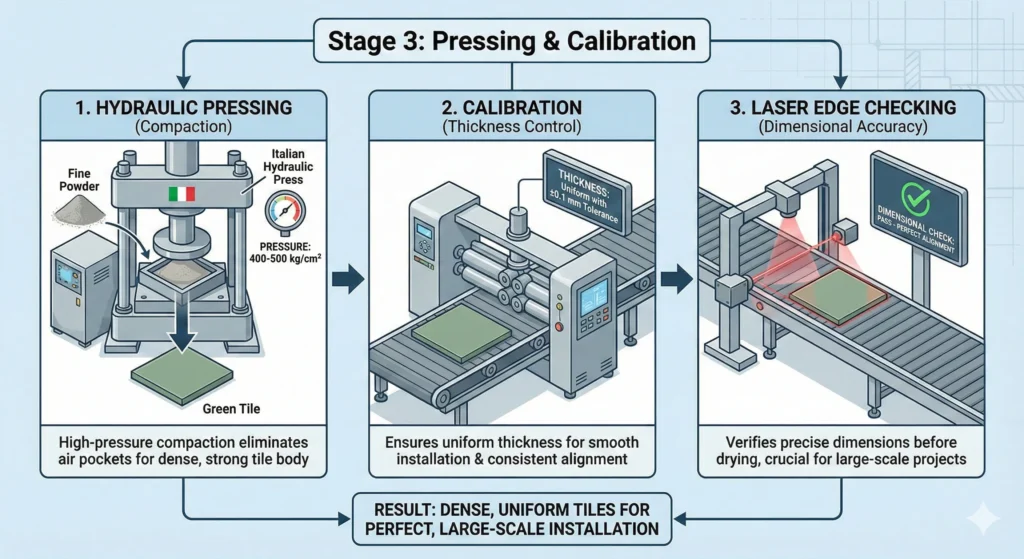 At Ramirro Ceramica, precision begins long before the tile is fired. In this stage, the fine powder from the spray dryer is compacted using Italian hydraulic presses that apply immense pressure often exceeding 400 to 500 kg/cm². This high pressure eliminates air pockets, creating dense, solid tile bodies with exceptional strength.