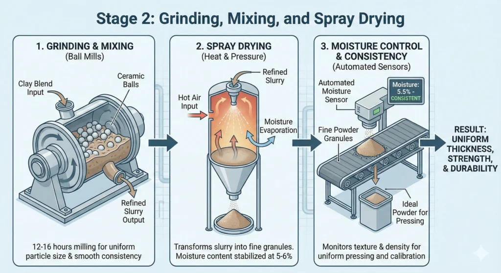 The refined slurry then passes through a spray dryer, where it is transformed into fine powder granules under carefully controlled heat and pressure. This step is critical, it stabilizes the moisture content at around 5 to 6%, making the powder ideal for pressing.